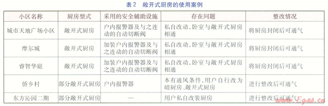據(jù)不完全統(tǒng)計,在當今時尚裝修中敞開式廚房的比例約為10%~20%,且有逐漸上升的趨勢,特別是北京、上海等地區(qū),敞開式廚房的理念已經(jīng)開始在人們的心頭生根發(fā)芽。在中國傳統(tǒng)的飲食習慣條件下,敞開式廚房存在著油煙難以排凈、清理衛(wèi)生不方便等問題。但是在生活習慣西方化的人群中卻得到了很大程度的認同,目前接受這一理念的主要是追求時尚、講究生活品質(zhì)的丁克家庭、單身人士,或者夫妻雙方都是非常忙碌很少在家中做飯的職場中人。這一新潮流從燃氣安全的專業(yè)角度來說存在著很多安全隱患,并與現(xiàn)有的相關(guān)規(guī)定矛盾,因此在燃氣管理中經(jīng)常與私改房屋用途的居民在供氣點火時發(fā)生沖突。例如南方某城市在燃氣管理過程中遇到了相當一部分敞開式廚房,見表2。