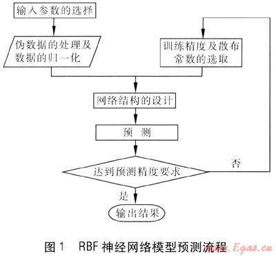 RBF網(wǎng)絡(luò)和普通的前向網(wǎng)絡(luò)有所不同,隱層神經(jīng)元是徑向基神經(jīng)元而不是tansig或者logsig神經(jīng)元。普通前向網(wǎng)絡(luò)中sigmoid神經(jīng)元能夠覆蓋較大的輸入?yún)^(qū)域,但是普通前向神經(jīng)元數(shù)目在訓(xùn)練前就已經(jīng)固定下來。而徑向基神經(jīng)元雖然只對相對較小的區(qū)域產(chǎn)生響應(yīng),但是在輸入?yún)^(qū)間較大時,可以適當(dāng)?shù)卦黾訌较蚧窠?jīng)元來調(diào)整網(wǎng)絡(luò),從而達到精度要求。且RBF網(wǎng)絡(luò)的設(shè)計比普通前向網(wǎng)絡(luò)訓(xùn)練要省時得多[6]。RBF網(wǎng)絡(luò)模型預(yù)測流程見圖1。