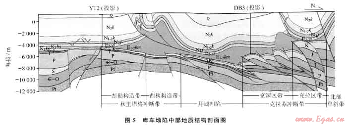 克深區(qū)帶是克拉蘇構(gòu)造帶的又一個(gè)次級(jí)構(gòu)造單元,呈NEE向條帶狀展布,東西長(zhǎng)約190km,南北最寬約17km。北側(cè)以克拉蘇斷裂為邊界,位于克拉區(qū)帶的下盤;南側(cè)以拜城斷裂為界,與拜城凹陷相接。拜城斷裂是克拉蘇構(gòu)造帶的南邊界斷裂,規(guī)模、性質(zhì)、斷開層位與克拉蘇斷裂相同。與克拉蘇斷裂相比,拜城斷裂斷距變小,最大垂直斷距約為2000m,斷面較緩,該斷裂控制克深區(qū)帶的南邊界。克深區(qū)帶還發(fā)育多條與克拉蘇斷裂、拜城斷裂近于平行的次級(jí)斷裂,斷裂性質(zhì)與兩邊界斷裂相似,規(guī)模相對(duì)較小,多條次級(jí)斷裂與2條邊界斷裂共同決定了克深區(qū)帶的構(gòu)造樣式(圖4、5)。