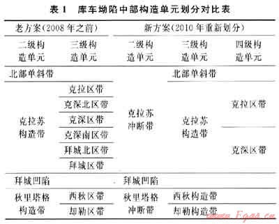 由于當(dāng)時(shí)勘探程度低,原構(gòu)造單元?jiǎng)澐址桨笇?duì)控制區(qū)帶劃分的其他因素考慮甚少。近年來,隨著油氣勘探的深入,尤其是構(gòu)造建模研究、區(qū)域構(gòu)造演化研究、油氣成藏研究取得重要進(jìn)展,構(gòu)造單元?jiǎng)澐址桨敢舶l(fā)生了改變。因此,筆者根據(jù)目前的研究成果對(duì)庫(kù)車坳陷中部構(gòu)造單元重新進(jìn)行劃分。