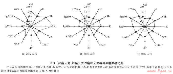 由于取心資料有限,要深入研究巖相特征,需要利用測(cè)井資料來實(shí)現(xiàn)。其基本原理主要是:不同沉積環(huán)境形成的巖石類別,其礦物成分、結(jié)構(gòu)、構(gòu)造等存在差異,導(dǎo)致地球物理屬性的差異,可在各種測(cè)井系列上出現(xiàn)差別響應(yīng),因而可根據(jù)各種測(cè)井信息的集總,建立各類巖相測(cè)井響應(yīng)歸一化模式庫(圖3)[3]。