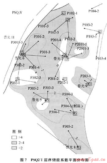 通過建立四級(jí)層序下儲(chǔ)能系數(shù)平面分布圖,可以看到平面上長(zhǎng)興組晚期的PSQ2 Ⅴ層序中礁體附近以及礁間灘體儲(chǔ)層對(duì)應(yīng)儲(chǔ)能系數(shù)高(圖7),相應(yīng)的儲(chǔ)層厚度大、物性好。而在飛仙關(guān)組各四級(jí)層序中,對(duì)應(yīng)儲(chǔ)能系數(shù)高的部位主要是層序多期灘核集中發(fā)育的區(qū)域,主要集中在飛仙關(guān)組早中期的層序TSQ1Ⅱ~Ⅴ中。
