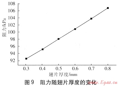 可以看出,翅片厚度對熱管的傳熱系數(shù)和傳熱量影響很小,但對阻力影響影響較大。翅片越薄,流動阻力越小。因此,應(yīng)盡可能選擇較薄的翅片。但翅片厚度的選取還要從機械強度、制造工藝以及耐腐蝕等方面進行考慮。