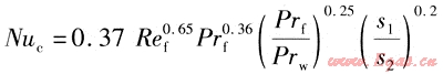 在設(shè)計過程中,傳熱系數(shù)的計算只能依靠經(jīng)驗公式,對于流體橫掠光管和翅片管的情況都要考慮。光管管束的計算使用茹卡烏斯卡斯總結(jié)出的平均表面?zhèn)鳠嵯禂?shù)的關(guān)聯(lián)式[5],螺旋翅片和整體翅片管束分別使用Briggs和Young的關(guān)聯(lián)式和Gray和Webb關(guān)聯(lián)式[6]。