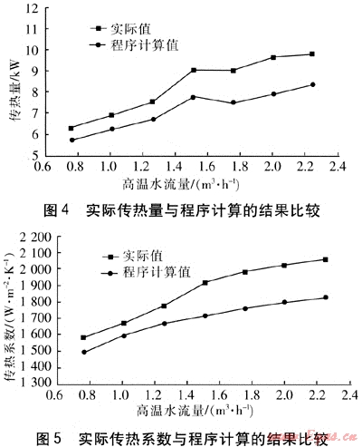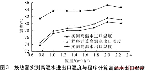 換熱器高溫水進出口溫度與程序計算高溫水出口溫度見圖3。由圖3可知,當高溫水流量在0.75~2.25m3/h變化時,實測的高溫水出口溫度與程序計算值的變化趨勢基本是一致的,但實測值比程序計算值低,即換熱器的實際傳熱量比程序計算的高。