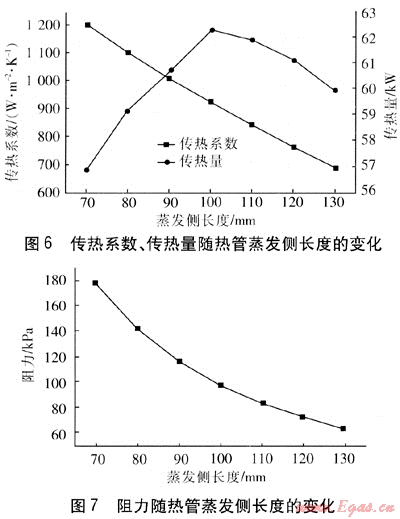 ① 在熱管總長度一定的情況下,隨著蒸發(fā)側(cè)長度增加,傳熱系數(shù)減小,但傳熱面積增加。因此,蒸發(fā)側(cè)長度的設(shè)定要綜合考慮流體的傳熱能力以及翅片對傳熱的強化作用,一般可以取管長的50%左右。