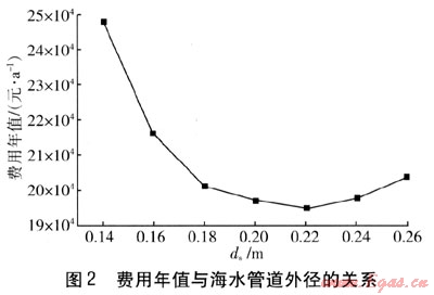 在θn,s=70℃,θn,r=50℃,θs,in=12℃,θs,out=8.6℃,θm,in=4℃,θm,out=8.2℃,以及海水流量為102.86m3/h,中介水流量為98.05m3/h的條件下,費用年值與ds的關(guān)系見圖2。由圖2可知,隨著ds的增加,費用年值降低很快,這是由于海水流速的降低使阻力降低,海水泵的耗電量降低。達到最低點(對應(yīng)最優(yōu)管徑)后,管徑繼續(xù)增加,管道造價增加較大,引起費用年值增加。