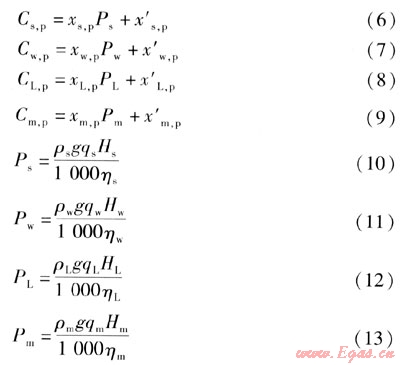 熱泵系統(tǒng)的循環(huán)泵包括海水泵、工質(zhì)泵、中介水泵和溶液泵,其價格可認為與循環(huán)泵的輸入功率呈線性關(guān)系,計算式分別為: