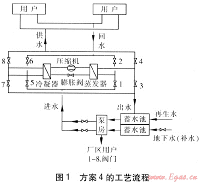 水源熱泵通過輸入少量電能,把不能直接利用的低位能量轉(zhuǎn)化成可利用的高位能量,實現(xiàn)節(jié)能。由于水源熱泵需要合適的水源,因此在應(yīng)用上受到一定限制,造價及節(jié)能程度也有所不同。一般情況下,若允許抽取地下水,則采用打井的辦法取水及回灌,有江河湖水的地方采用水源熱泵也是不錯的選擇。但有時某些場所不具備水源條件,或由于冬季水溫較低,影響熱泵運行。供水中心采用水源熱泵恰好克服了以上不足:①有供廠區(qū)的再生水和補充水(地下水),可直接從中取用一部分,不需打井取水。②熱泵出水直接排入供水中心的蓄水池,不用打井回灌。③再生水溫在20℃以上,冬季用于熱泵供熱;當夏季需制冷時,采用補充水(地下水)作為水源,水溫常年保持在12~13℃,有利提高熱泵效率。④熱泵與用戶同處一地,管道造價很低。因此,我們決定采用方案4。