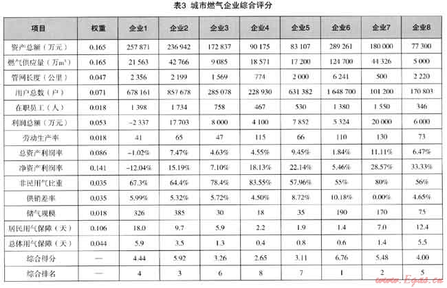 根據(jù)已經(jīng)建立的評價體系,我們對國內(nèi)12家運營較規(guī)范燃氣企業(yè)進行了調(diào)研,并從中選擇數(shù)據(jù)反饋完整的8家企業(yè)進行比較。根據(jù)8家企業(yè)經(jīng)營指標(biāo)(截止至2010年底)的相對優(yōu)劣,分別計算每個企業(yè)每個項目得分(0分-10分),各項加權(quán)匯總后為企業(yè)綜合得分。(見表3)