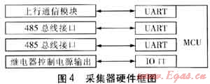 采集器的任務(wù)就是轉(zhuǎn)發(fā)集中器和燃?xì)獗碇g的通信數(shù)據(jù),并在抄讀燃?xì)獗淼臅r(shí)候短暫地給燃?xì)獗淼碾娮硬糠止╇姟2杉骱图衅髦g的通信采用了電力線(xiàn)載波通信方式。電力線(xiàn)載波通信有通信不穩(wěn)定、易受干擾的缺點(diǎn),但采集器只要在軟件上做些改進(jìn)就能極大地彌補(bǔ)這一缺點(diǎn),例如能短時(shí)間地儲(chǔ)存燃?xì)獗淼臄?shù)據(jù)。這樣當(dāng)給集中器返回的燃?xì)獗頂?shù)據(jù)因信道不穩(wěn)定而丟失時(shí),集中器再次下發(fā)抄這塊表的數(shù)據(jù)時(shí),采集器就不用再去抄燃?xì)獗砹?,而是很快地直接返回采集器?chǔ)存的數(shù)據(jù),這樣就使抄表成功率大大提高。采集器也要求采用可更換的通信模塊,儲(chǔ)存容量不需要太大,采集器MCU要有至少3個(gè)UART,還要有給燃?xì)獗砉╇妴卧?。采集器的硬件框圖見(jiàn)圖4。MCU的1個(gè)UART和上行通信模塊相連,2個(gè)UART設(shè)計(jì)成RS485總線(xiàn)。這2個(gè)RS485接口,1個(gè)是和燃?xì)獗硗ㄐ庞茫?個(gè)保留和集中器通信。如果采集器和集中器距離很近,就用保留的RS485接口直接和集中器相連。同時(shí)MCU控制1個(gè)繼電器給直讀式燃?xì)獗淼碾娮硬糠止╇姟?/span>