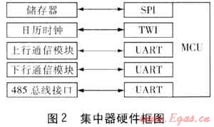 集中器的任務(wù)較多,主站抄讀實(shí)時(shí)數(shù)據(jù)時(shí)也要求集中器有一定的實(shí)時(shí)性要求,這就要求集中器中的微處理器(MCU)有較高的運(yùn)算速率。集中器的通信接口較多,要求集中器至少有3個(gè)通用異步串行接口(UART):1個(gè)UART和上行通信模塊通信,1個(gè)UART和下行通信模塊通信,另1個(gè)UART設(shè)計(jì)成RS485接口,這個(gè)RS485接口主要用于當(dāng)集中器和采集器距離很近時(shí),集中器直接通過(guò)這個(gè)RS485接口和采集器直接通信,而不需要通過(guò)下行通信模塊了。集中器內(nèi)選擇同步串行接口(SPI)的儲(chǔ)存器,它具有接線(xiàn)少、儲(chǔ)存量大的優(yōu)點(diǎn)。MCU需要有至少1個(gè)SPI接口。集中器做日凍結(jié)數(shù)據(jù)和月凍結(jié)數(shù)據(jù)時(shí)所需要的日歷時(shí)鐘大多采用兩線(xiàn)制串行接口(TWI),這就需要MCU要有TWI接口。隨著電子技術(shù)和計(jì)算機(jī)通信技術(shù)的發(fā)展,能實(shí)現(xiàn)這樣功能的MCU有很多。集中器設(shè)計(jì)時(shí)還要內(nèi)置防雷器件。集中器硬件框圖見(jiàn)圖2。