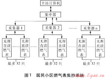 居民小區(qū)燃?xì)獗砑到y(tǒng)見(jiàn)圖1。系統(tǒng)由3部分組成,即燃?xì)獗?、集抄設(shè)備和主站。與傳統(tǒng)方式不同的是集抄設(shè)備不再是集中器一種設(shè)備,而是由集中器和采集器組成。集中器每天或每月輪抄1遍所轄的燃?xì)獗恚@個(gè)過(guò)程需要通過(guò)采集器轉(zhuǎn)發(fā)配合完成。集中器把數(shù)據(jù)保存在儲(chǔ)存器中然后等待主站發(fā)命令讀取。主站每天或每月定時(shí)讀取集中器內(nèi)的數(shù)據(jù),也可以通過(guò)集中器和采集器實(shí)時(shí)地讀取燃?xì)獗淼臄?shù)據(jù)。這個(gè)系統(tǒng)中燃?xì)獗磉x用無(wú)源直讀燃?xì)獗怼?/span>
