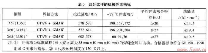 燃?xì)庹{(diào)壓裝置制造公司可根據(jù)自身特點(diǎn),選用國(guó)內(nèi)焊接材料,在管線鋼的焊接中采用SMAW+GMAW和GTAW+GMAW,焊后試件各項(xiàng)機(jī)械性能指標(biāo)均達(dá)到規(guī)范要求。焊材和部分試件機(jī)械性能指標(biāo)見表4、5。