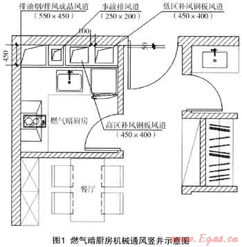 第一方案,從各層外墻引入截面尺寸為500×250的自然進(jìn)風(fēng)管(負(fù)壓抽吸的流速不大于1m/s),但因建筑外立面、室內(nèi)凈高和裝修要求的限制,無(wú)法直接安裝該自然進(jìn)風(fēng)管,而且該方式無(wú)法解決燃?xì)獍祻N房的“泄爆”問(wèn)題,只能歸到與外窗不相鄰、且“通風(fēng)不良”——規(guī)范所不允許的狀況;