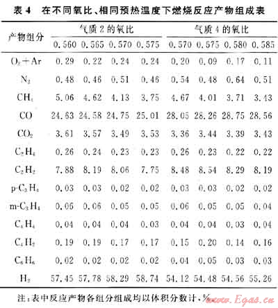 從表2也可以看出,在相同反應(yīng)條件下,隨著從氣質(zhì)1至氣質(zhì)4有機(jī)碳總量的增加,裂化產(chǎn)物中乙炔含量不斷增加,而剩余甲烷含量并未減少,反而呈增加趨勢,這也說明了在相同耗氧量的情況下,氣質(zhì)4裂解生成乙炔的能力更高。但另一方面也可以看出,裂解產(chǎn)物中合成氣(H2+CO)含量在減少,這也充分說明了乙炔產(chǎn)量的增加是以合成氣的減少為代價的。