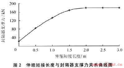 封隔器安全坐封力為9.07t,而壓裂時坐封力為21.1kN,小于封隔器安全坐封力,同時封隔器對套管作用力達460.26kN。元壩2井事故分析結(jié)果為:施工中封隔器承受上頂力較大,膠皮密封不嚴,存在柒性竄漏,同以上理論計算結(jié)果相符合。因此,采用本研究方法設(shè)計伸縮短接,針對管柱受力最惡劣的擠酸工況,采用不同伸縮短接長度對封隔器支撐力進行敏感性分析,分析結(jié)果如圖2所示。