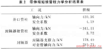 通過以上敏感性分析,設(shè)計1.7m伸縮短接便可有效補償擠酸工況管柱變形附加力。以下對安裝伸縮短接后的管柱進行力學(xué)分析和強度校核,結(jié)果見表2。