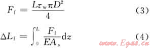 對于帶封隔器井下管柱,隨著井筒壓力、溫度等參數(shù)變化而產(chǎn)生溫度效應(yīng)、活塞效應(yīng)、鼓脹效應(yīng)、螺旋彎曲效應(yīng)。對這4個基本效應(yīng)產(chǎn)生的管柱變形及其變形力,國內(nèi)外學(xué)者已經(jīng)做了大量研究,此不贅述。對于深層氣井,高速擠酸過程中,流體粘滯摩阻效應(yīng)是引起管柱變形的重要因素,也是造成管柱、封隔器失效的主要原因。因此,在分析管柱變形時除了要考慮上述4種基本效應(yīng)外,還必須考慮流體粘滯摩阻效應(yīng),粘滯摩阻力(Ff)和摩阻效應(yīng)變形(△Lf)分別由下式表示[7~8]: