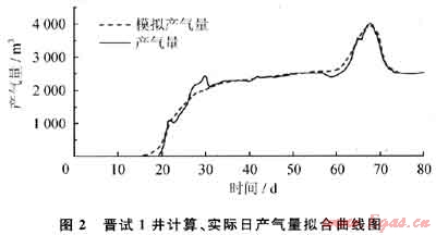 晉試1井巖心觀察及電鏡掃描結果顯示,鉆遇的煤層裂縫發(fā)育,分布不均勻,裂隙與層面斜交或平行展布。圖2是模型計算的晉試1井前80d的日產(chǎn)氣量與實際日產(chǎn)氣量的擬合曲線,計算過程中采用時間步長為1d,通過對初始參數(shù)進行調(diào)整,使模型模擬計算的日產(chǎn)氣量與實際日產(chǎn)氣量達到較好的擬合效果。由此表明,利用此模型進行考慮吸附變形的煤層氣分階段流動過程的驗證及對產(chǎn)量進行預測是可行的。