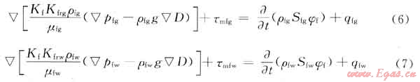 根據(jù)質(zhì)量守恒原理和達西定律推導出煤層裂隙系統(tǒng)中氣、水兩相的滲流微分方程分別為: