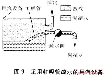 采用虹吸管疏水時(見圖9),用汽設備中的凝結水由蒸汽推動進入疏水管道,因此凝結水易與蒸汽一同進入疏水閥,導致蒸汽鎖的產(chǎn)生。這時可通過使用蒸汽鎖釋放閥來釋放部分蒸汽,確保混有蒸汽的凝結水能夠無阻礙地連續(xù)流入疏水閥[7~8]。