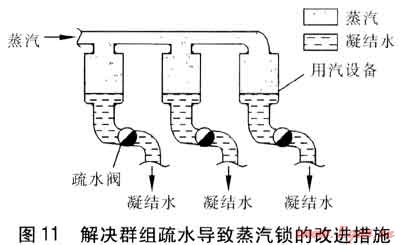 不同用汽設備產(chǎn)生的凝結水量是不相同的(見圖10),當圖10中右側(cè)最遠端用汽設備產(chǎn)生的凝結水量逐漸減少時,蒸汽進入疏水閥,疏水閥關閉。此時,盡管另外兩臺用汽設備仍在產(chǎn)生凝結水,但是由于疏水閥已經(jīng)關閉,凝結水無法排出,導致用汽設備內(nèi)積水。對每臺用汽設備分別安裝疏水閥進行有效排除凝結水,而且不會受到其他用汽設備凝結水量的影響,見圖11。