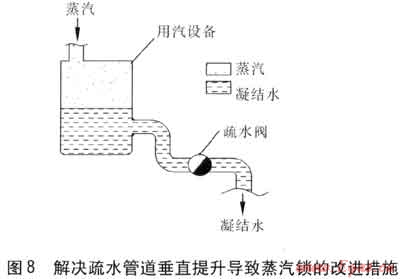 若疏水管道垂直提升,蒸汽則先進入疏水閥,進而發(fā)生蒸汽鎖[6],見圖7。解決這種蒸汽鎖的方法是改變疏水管道的結構,見圖8。使得凝結水可以依靠重力自然流動,不易發(fā)生蒸汽鎖。