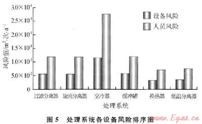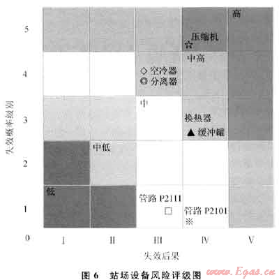 2) 注采氣站風(fēng)險(xiǎn)評(píng)估結(jié)果表明:壓縮機(jī)系統(tǒng)和處理系統(tǒng)風(fēng)險(xiǎn)遠(yuǎn)遠(yuǎn)大于管路系統(tǒng)風(fēng)險(xiǎn),其中壓縮機(jī)組最大;處理系統(tǒng)設(shè)備中空冷器風(fēng)險(xiǎn)最大,其次是緩沖罐(壓縮機(jī)出口)、過(guò)濾分離器和旋流分離器(圖5);而管路系統(tǒng)中對(duì)帶壓的34條管線(xiàn)中,從壓縮機(jī)出口到緩沖罐出口的管線(xiàn)P2112~P2118風(fēng)險(xiǎn)最大,其中P2113最大,管路系統(tǒng)風(fēng)險(xiǎn)值大主要是由于壓力和溫度相對(duì)較高引起的。采用風(fēng)險(xiǎn)矩陣對(duì)各類(lèi)設(shè)備或管路風(fēng)險(xiǎn)定級(jí)可知:壓縮機(jī)風(fēng)險(xiǎn)為高風(fēng)險(xiǎn),而管路系統(tǒng)均為中低風(fēng)險(xiǎn)(圖6)。通過(guò)風(fēng)險(xiǎn)排序,明確了高風(fēng)險(xiǎn)單元,即可采用HAZOP法進(jìn)行詳細(xì)風(fēng)險(xiǎn)分析。