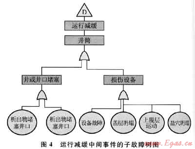 1) 建立故障樹(shù),以地下儲(chǔ)氣設(shè)施失效作為頂事件,而泄漏和注采能力下降作為次級(jí)事件(如圖3所示),圖3中的A、B、C、D則分別表示泄漏到大氣、通過(guò)地層泄漏、運(yùn)行中斷和運(yùn)行減緩中間事件,并可進(jìn)一步建立子故障樹(shù),圖4為運(yùn)行減緩中間事件的子故障樹(shù)。