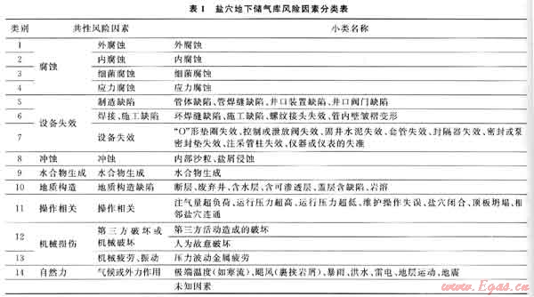 通過(guò)對(duì)地下溶腔、注采管柱、注采井口、天然氣處理系統(tǒng)、壓縮機(jī)組、工藝管路和地面集輸管線(xiàn)7個(gè)子單元的工作過(guò)程系統(tǒng)分析,并結(jié)合事故原因統(tǒng)計(jì)分析結(jié)果和借鑒管道風(fēng)險(xiǎn)因素歸類(lèi)方法,確定了鹽穴地下儲(chǔ)氣庫(kù)風(fēng)險(xiǎn),包括腐蝕、設(shè)備失效、沖蝕、水合物生成、地質(zhì)構(gòu)造、操作相關(guān)、機(jī)械損傷以及自然力8類(lèi)共性風(fēng)險(xiǎn),可細(xì)分為14大類(lèi)和45小類(lèi)風(fēng)險(xiǎn)因素(表1)。