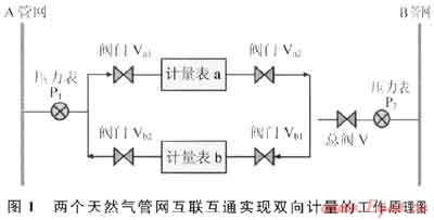 在兩個(gè)天然氣管網(wǎng)(A、B)聯(lián)通處的兩側(cè)分別設(shè)置用于測(cè)量管網(wǎng)實(shí)際運(yùn)行壓力的壓力表(P1、P2),同時(shí)設(shè)置兩個(gè)方向相反的單向計(jì)量通道:A管網(wǎng)通過計(jì)量?jī)x表a向B管網(wǎng)補(bǔ)充天然氣;B管網(wǎng)通過計(jì)量?jī)x表b向A管網(wǎng)補(bǔ)充天然氣。