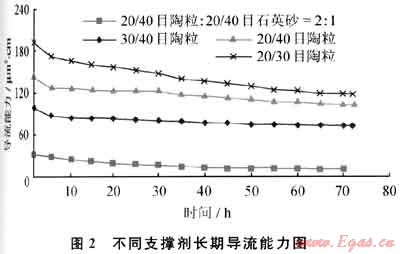 30/40目、20/40目和20/30目3種不同規(guī)格陶粒72h后導(dǎo)流能力分別為73.16μm2·cm、102.5μm2·cm和118.3μm2·cm,粒徑較大,導(dǎo)流能力較好??梢钥闯觯S著時(shí)間的推移,粒徑增大,導(dǎo)流能力下降速度較快,但其末期導(dǎo)流能力仍高于較小粒徑支撐劑。
