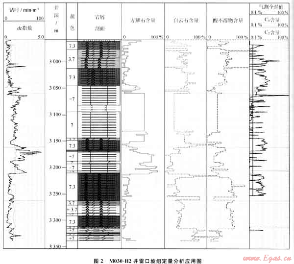 針對碳酸鹽巖地層,顯微識別定量分析巖性存在困難,應用碳酸鹽巖定量分析技術,對M030-H2井進行分析,在2961~3046m、3148~3164m、3208~3308m儲層段,顯示方解石含量低,白云石含量高,對應綜合錄井參數(shù)為低鉆時,高氣測值段。證實碳酸鹽巖定量分析獲得的方解石、白云石、酸不溶物含量與巖屑剖面、鉆時、氣測等資料對比吻合性較好,快速識別出白云巖儲層(圖2)。