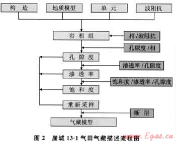 這次氣藏描述通過(guò)使用多步驟、復(fù)合地質(zhì)統(tǒng)計(jì)模擬技術(shù),構(gòu)建了多個(gè)具有同等概率分布的巖相組、孔隙度和滲透率模型,圖2是崖城13-1氣田氣藏描述流程。巖相組模式是這個(gè)流程的基本模型,它是以巖心的巖相描述資料為基礎(chǔ),用三維地震波阻抗體進(jìn)行外推,應(yīng)用分類變量條件序貫指示模擬方法(SISIMPDFP)來(lái)構(gòu)建的,模擬的實(shí)現(xiàn)與實(shí)際的鉆井資料和地質(zhì)模型保持一致。在這個(gè)模型的基礎(chǔ)上,選擇巖相組模型和特定巖相組的孔隙度統(tǒng)計(jì)結(jié)果,使用序貫高斯模擬方法(SGSIM)估算孔隙度值。滲透率的分布則根據(jù)不同的巖相組、孔隙度以及用井資料確立的孔-滲關(guān)系,利用序貫高斯協(xié)模擬(SGCOSIM)來(lái)確定。