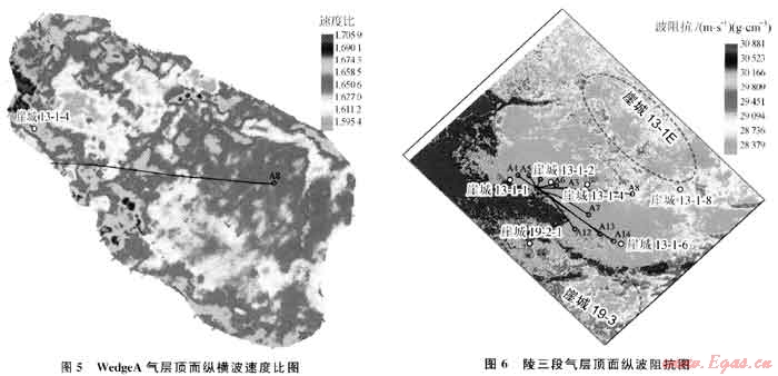 理論計(jì)算、正演模擬和實(shí)際道集分析均表明崖城13-1氣田陵三段氣層具有Ⅳ類AV0特征,那么三亞組和陵三段氣層周邊的勘探目標(biāo)是否也屬Ⅳ類AVO特征呢?三亞組的WedgeA砂體在2000年之前只有崖城13-1-4井鉆遇,鉆遇的地層厚度為111.3m,但氣層厚度只有6m,且物性較差,滲透率只有14mD,之前的地質(zhì)研究成果認(rèn)為該砂體的開(kāi)發(fā)潛力不大。但是該砂體在地震資料上反射特征清楚,通過(guò)對(duì)比追蹤、AV0分析和疊前AV0反演認(rèn)為該砂體具有與陵三段氣層相同的Ⅳ類AVO特征(圖4),從反演得到的WedgeA頂面縱橫波速度比分布圖(圖5)可以看出崖城13-1-4井鉆遇了WedgeA砂體的邊部,相對(duì)整個(gè)砂體來(lái)說(shuō)崖城13-1-4井位置物性較差,而該砂體東部物性變好、含氣性特征更明顯、厚度也變大,通過(guò)崖城13-1-4井層速度預(yù)測(cè)砂體A8井處氣層厚度在50m以上,基于上述的地震預(yù)測(cè)結(jié)果決定鉆探A8井。于2000年在崖城13-1-4井東邊鉆探了A8井,在該砂體鉆遇氣層厚度達(dá)65.2m,滲透率高達(dá)1600mD、日產(chǎn)氣150×104m3,是目前該氣田產(chǎn)量最高的井之一,從而證實(shí)了鉆前的地震預(yù)測(cè)結(jié)果。