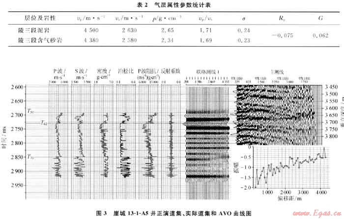 為了確定崖城13-1氣田陵三段的AV0類型,首先從理論出發(fā)統(tǒng)計(jì)了井上的氣層及上覆地層的屬性參數(shù),包括縱橫波速度、密度、泊松比等參數(shù),并通過(guò)Shuey’s的簡(jiǎn)化Zoeppritz方程計(jì)算了反射系數(shù),發(fā)現(xiàn)氣層頂面的反射系數(shù)大,而泊松比變化較小(表2),滿足產(chǎn)生第Ⅳ類異常的條件;接著選擇代表性的井(A5井)進(jìn)行了正演模擬,模擬結(jié)果顯示該井正演道集的氣層頂面均對(duì)應(yīng)波谷(負(fù)反射系數(shù)),并且隨著偏移距的增加振幅有減弱的跡象;隨后對(duì)實(shí)際的地震道集進(jìn)行了AV0分析(圖3),從實(shí)際道集中提取的氣層頂面AV0曲線表明:在偏移距200~4500m的變化范圍內(nèi),反射系數(shù)均為負(fù)值,并且其絕對(duì)值隨著偏移距的增多而減小,證實(shí)了該氣藏的Ⅳ類AV0特征。另外,在沒(méi)有鉆井的地方也對(duì)實(shí)際地震道集進(jìn)行了AV0分析,均顯示為Ⅳ類AV0特征。