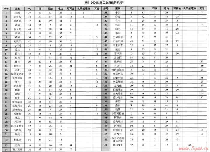 當(dāng)今我國研究節(jié)能、減排的許多文獻(xiàn)中均常出現(xiàn)以我國單位GDP的能耗與國外特別是發(fā)達(dá)國家的情況相比較,得出的結(jié)論是“差距很大,因而可挖的潛力也很大”,克服差距的手段是“科技進(jìn)步”,采用的方法是關(guān)停產(chǎn)能落后的企業(yè)。,實(shí)際上節(jié)能減排不僅與科技進(jìn)步有關(guān),也與一個(gè)國家的能源構(gòu)成有關(guān)。不同能源構(gòu)成國家的節(jié)能減排在宏觀上存在許多不可比性,應(yīng)有實(shí)事求是的分析。為此,本文根據(jù)國際燃?xì)饴?lián)盟多年公布的研究資料,做一些分析探討,從本世紀(jì)以來世界的能源構(gòu)成開始。