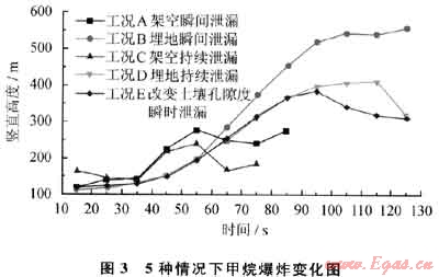 從圖3可知:與架空管道相比,埋地管道泄漏爆炸范圍大且影響時(shí)間長(zhǎng)。埋地管道爆炸范圍呈指數(shù)增加,當(dāng)達(dá)到一定高度后不再升高,濃度隨擴(kuò)散而減低至爆炸下限外。而架空管道爆炸范圍在85s前增加,且高度比埋地要高,而在85s后降低。這是由于埋地敷設(shè)管道泄漏后,氣體速度經(jīng)過土壤孔隙阻力、慣性阻力的作用,降低較快,甲烷爆炸范圍的起點(diǎn)較小,在一定時(shí)間內(nèi)其爆炸范圍比架空要小;隨著泄漏的持續(xù),甲烷向周圍環(huán)境緩慢擴(kuò)散,由于受風(fēng)力影響較小,在85s后其高度均比架空要高??紫抖仍酱笃溆绊懛秶叫 ?/span>
