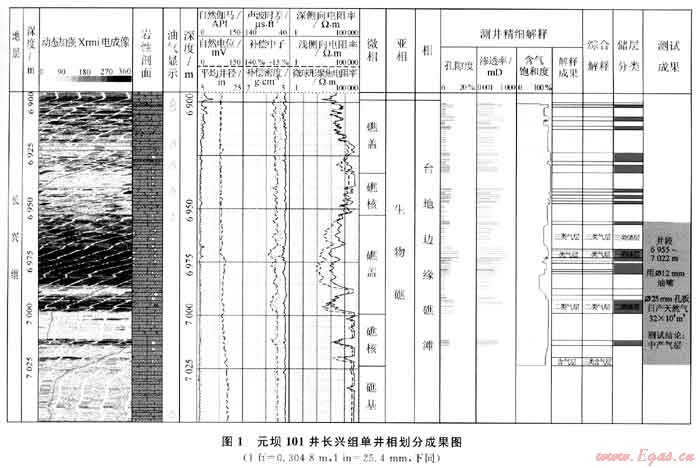 在區(qū)域地質(zhì)背景分析的基礎(chǔ)上,綜合利用成像測井、常規(guī)測井及巖屑薄片鑒定等資料,結(jié)合實際鉆探成果進行了研究區(qū)長興組的單井相劃分。以元壩101井單井相劃分為例(圖1),圖中顯示該段地層自然伽馬低值,約10API,巖性純,以淺灰色白云巖、溶孔白云巖及生屑灰?guī)r為主,夾有云質(zhì)灰?guī)r和含云灰?guī)r;成像圖像上可見6900~6925m和6950~7000m裂縫及溶蝕孔洞非常發(fā)育,對應(yīng)的孔隙度曲線明顯增大,儲集物性好,電阻率曲線較致密圍巖明顯降低,呈大幅度正差異特征,儲層滲透性好。這些特征反映當時的沉積水體相對較淺,沉積水體能量較強,白云巖化作用較強,易形成溶蝕孔洞白云巖儲層,為臺地邊緣生物礁儲層沉積特征。取心資料顯示,該井段含有大量生物碎屑,這些生屑多為有孔蟲類、腕足類及鰱的化石,而這些生物正是區(qū)域上長興組沉積時期生物礁的附礁生物[2];結(jié)合研究區(qū)所有單井的長興組沉積相分析結(jié)果,綜合認為該地層屬于臺地邊緣礁灘相沉積。