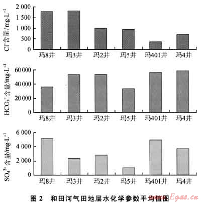 統(tǒng)計分析結(jié)果表明,井間地層水的化學(xué)特征也存在較大的差異(圖2)。地層水在西部的瑪8、瑪3井明顯富含HC03-,可能與西部保存條件相對較差有關(guān)。東部的瑪4等井HC03-的含量明顯偏低。Cl-、S042-含量等參數(shù)在井間變化大,無規(guī)律性,說明井間的地層水連通性差,不是統(tǒng)一的連通底水。在同一口井縱向上水性也有差異,而且沒有明顯的變化趨勢,瑪8井古潛山頂面HC03-含量較高,Cl-濃度低,其他參數(shù)縱向上也有變化?,?井地層水各項參數(shù)隨深度變化也有差異,可能預(yù)示縱向上不同儲層段連通性差,不同層段地層水有分隔??傮w而言,該區(qū)地層水的Cl-、HC03-、S042-含量等參數(shù)在平面上與縱向上都有較大的變化,沒有統(tǒng)一的塊狀底水。