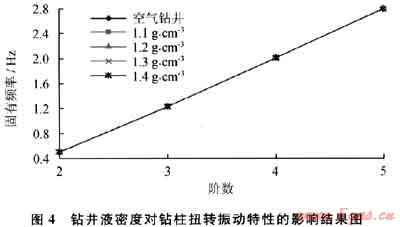 考慮空氣鉆井和不同鉆井液密度情況下的鉆柱扭轉(zhuǎn)振動(dòng),計(jì)算結(jié)果如圖4所示。從圖4可看出,伴隨鉆井液密度變化,鉆柱扭轉(zhuǎn)振動(dòng)的固有頻率保持不變。