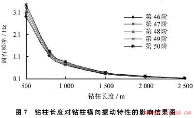 取固有頻率階數(shù)為第46~50時(shí)的固有頻率值比較,鉆柱長(zhǎng)度對(duì)振動(dòng)的影響計(jì)算結(jié)果如圖7所示。鉆柱長(zhǎng)度增加,其橫向振動(dòng)固有頻率明顯降低。鉆柱長(zhǎng)度的變化對(duì)直井整體鉆柱橫向振動(dòng)特性影響非常明顯。根據(jù)計(jì)算結(jié)果,把固有頻率轉(zhuǎn)換成轉(zhuǎn)速,整體鉆柱長(zhǎng)度為500m時(shí),其對(duì)應(yīng)轉(zhuǎn)速在轉(zhuǎn)盤(pán)轉(zhuǎn)速60~70r/min的固有頻率有3階;鉆柱長(zhǎng)度為800m時(shí),有5階;鉆柱長(zhǎng)度為1000m時(shí),有7階;鉆柱長(zhǎng)度為1500m時(shí),有13階;鉆柱長(zhǎng)度為2000m時(shí),達(dá)16階;鉆柱長(zhǎng)度為2500m時(shí),共有20階之多。