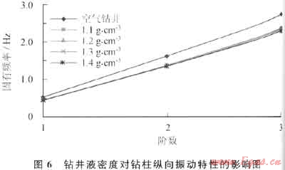 考慮鉆井液對(duì)鉆柱縱向振動(dòng)影響,計(jì)算結(jié)果如圖6所示。由圖6可見(jiàn),有鉆井液時(shí),縱向振動(dòng)的固有頻率比無(wú)鉆井液時(shí)頻率低很多。分析發(fā)現(xiàn),鉆井液密度為1.1g/cm3時(shí),第1~3階固有頻率比無(wú)鉆井液時(shí)降低了18%左右且鉆井液密度越高,鉆柱的固有頻率越低。