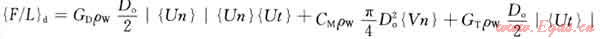 式中{F/L}d表示由于液體動(dòng)力效應(yīng)引起的單位長(zhǎng)度上的載荷;CD表示法向阻力系數(shù);ρw表示外部液體的密度;Do表示管柱實(shí)際外徑;{Un}表示法向相對(duì)速度矢量;CM表示慣性系數(shù);{Vn}表示法向加速度矢量;CT表示切向阻力系數(shù);{Ut}表示切向上相對(duì)速度矢量。