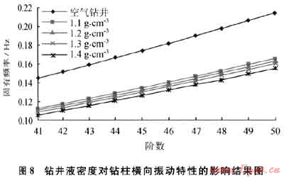 由于鉆井液的存在,鉆柱在進(jìn)行軸向運(yùn)動(dòng)的時(shí)候,受到鉆井液的黏滯作用。根據(jù)鉆井液的流變特性,其密度越高,黏度越大,對(duì)鉆柱軸向運(yùn)動(dòng)的阻礙作用越明顯。可見(jiàn),鉆井液會(huì)對(duì)鉆柱縱向振動(dòng)的固有頻率產(chǎn)生很大影響,改變縱向振動(dòng)的臨界轉(zhuǎn)速,這種影響必須引起足夠的重視。