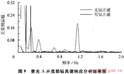 從圖9可以看出,普光A井底部鉆具組合在0.2Hz和1.1Hz的頻率下,產(chǎn)生了很大的位移響應(yīng),即在轉(zhuǎn)速為12r/min和66r/min時(shí),鉆柱很容易產(chǎn)生較大的橫向共振,使鉆柱內(nèi)部產(chǎn)生很大的交變應(yīng)力。而使用鉆井液時(shí)鉆柱只在頻率為0.14Hz時(shí)產(chǎn)生很大位移響應(yīng),對(duì)應(yīng)的轉(zhuǎn)速為8.4r/min,遠(yuǎn)遠(yuǎn)小于常用轉(zhuǎn)速,不會(huì)對(duì)鉆柱產(chǎn)生實(shí)質(zhì)性危害。普光A井在空氣鉆井時(shí)采用了65r/min的轉(zhuǎn)速,外部激勵(lì)頻率與使鉆柱產(chǎn)生最大位移響應(yīng)的固有頻率非常接近,極易發(fā)生鉆柱的橫向共振,在鉆進(jìn)過(guò)程中,出現(xiàn)了3次鉆柱斷裂事故,理論計(jì)算與現(xiàn)場(chǎng)結(jié)果吻合。