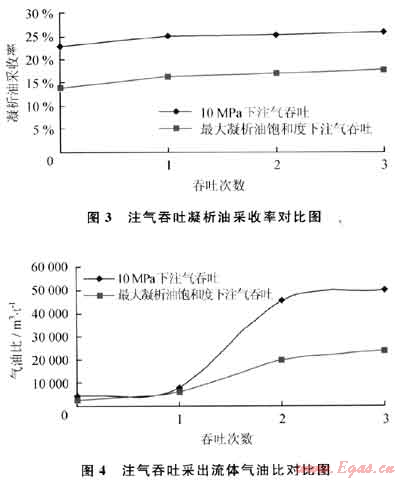 兩種實驗結果表明凝析油采收率均不高。前者吞吐3次后,凝析油采收率為17.60%,而后者吞吐3次可得凝析油采收率25.61%,這是由于壓力增加蒸發(fā)部分析出凝析油,但壓力下降后馬上又析出,沒有建立驅(qū)動循環(huán),因此采收率低,說明采用單井吞吐效果不好。