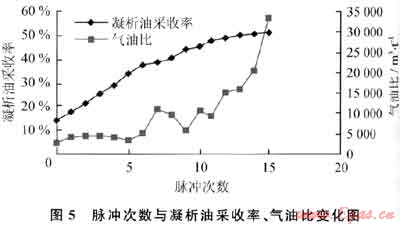 圖5為脈沖次數(shù)與凝析油采收度、氣油比的變化關系,在31MPa開始進行脈沖注氣,雖然脈沖壓力波動范圍都是25%,但由于建立了單向流動通道,因此采收率相對較高,脈沖很多次后仍有一定油量采出,在進行15次脈沖時,油采出程度51.23%,增加凝析油采收率37.62%。說明在裂縫孔洞型碳酸鹽儲層中,建立注采循環(huán)系統(tǒng)后,有壓力脈沖可使部分凝析液得到反蒸發(fā),從而比最大凝析油飽和度下注氣凝析油采收率提高了4%左右。