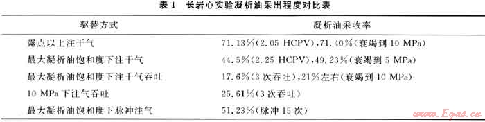 長巖心實驗結果表明,裂縫-孔洞型碳酸鹽巖凝析氣藏的單井吞吐不能有效提高凝析油采收率,對有兩口井以上的裂縫單元,應考慮露點壓力以上直接注氣或最大凝析油飽和度下脈沖注氣方式來進行開發(fā)。露點壓力以上由于凝析油不析出,因此采收率最高。